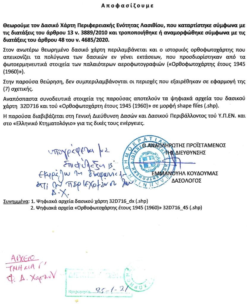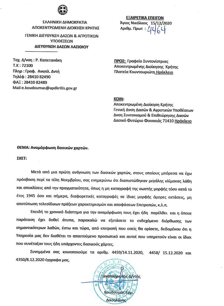 Χιλιάδες πολίτες ταλαιπωρούνται. Είναι πολύ σημαντικό να τονιστεί ότι ο Προϊστάμενος Δασών Λασιθίου είχε υπογράψει με επιφύλαξη τους δασικούς χάρτες, εκφράζοντας ρητά τη διαφωνία του επί του περιεχομένου των Δασικών Χαρτών.