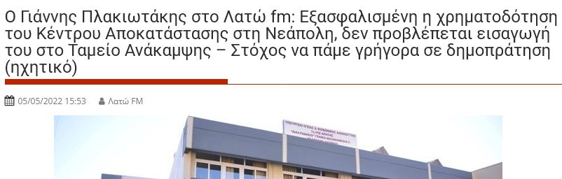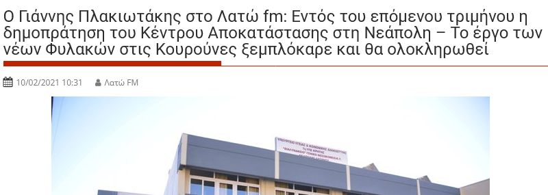 Ο κ. Πλακιωτάκης, είχε δηλώσει δημόσια στις 20/02/2021, ότι το έργο θα ξεκινούσε “εντός τριμήνου“. Τρίμηνα πέρασαν πολλά, αλλά προχωρά μόνο η κοροϊδία εις βάρος μιας ολόκληρης κοινωνίας που πίστεψε πως η Κρήτη θα αποκτήσει επιτέλους ένα σύγχρονο κέντρο αποκατάστασης.