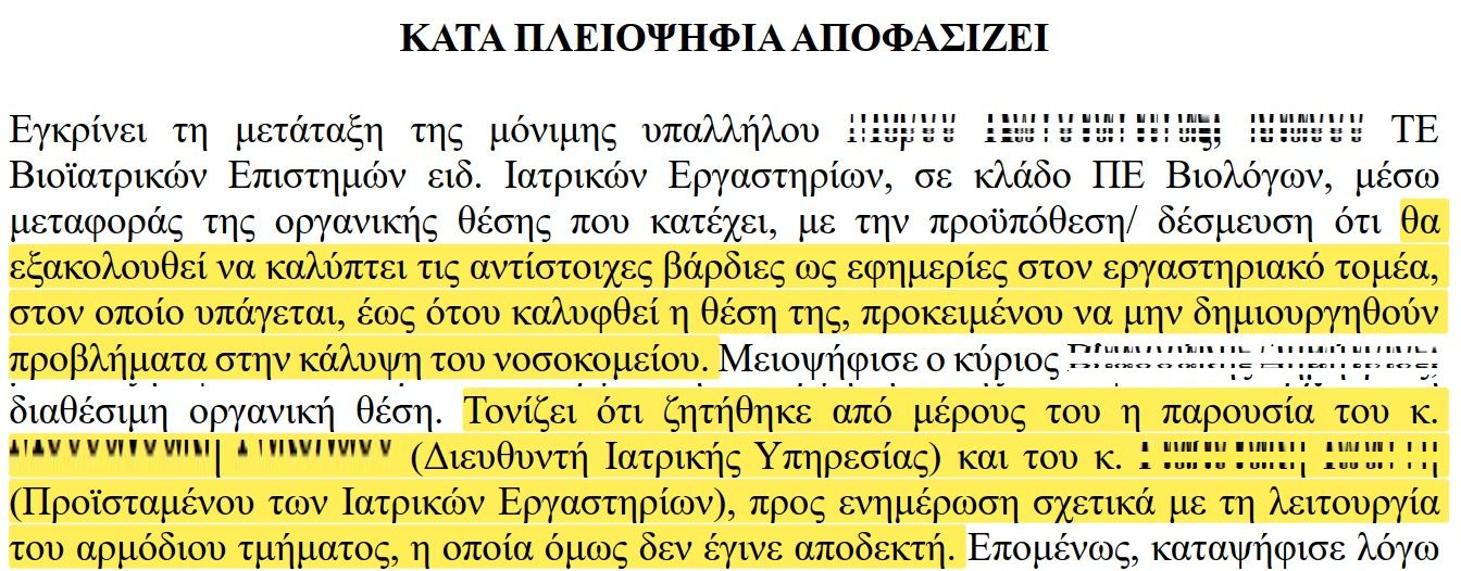 Το ΔΣ αποδέχεται το πρόβλημα που δημιουργεί η μετάταξη. Αναφέρει συγκεκριμένα: “με την προϋπόθεση/ δέσμευση ότι θα εξακολουθεί να καλύπτει τις αντίστοιχες βάρδιες ως εφημερίες στον εργαστηριακό τομέα, στον οποίο υπάγεται, έως ότου καλυφθεί η θέση της, προκειμένου να μην δημιουργηθούν προβλήματα στην κάλυψη του νοσοκομείου“.