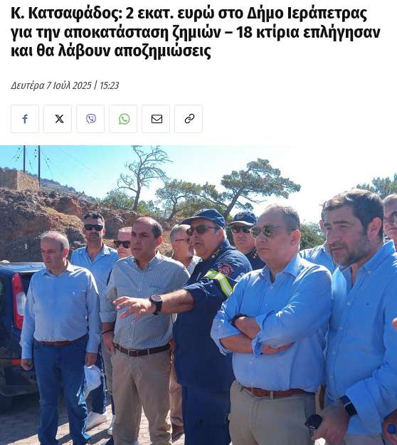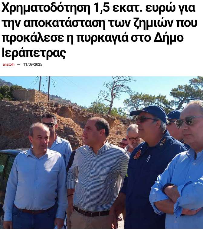 Στις 2 Ιουλίου 2025, ξέσπασε μεγάλη πυρκαγιά στην Ιεράπετρα, προκαλώντας σοβαρές ζημιές σε υποδομές, δρόμους και αγροτικές καλλιέργειες, αφήνοντας την τοπική κοινωνία αντιμέτωπη με μια δύσκολη πραγματικότητα. Στις 7 Ιουλίου 2025, ο υφυπουργός Πολιτικής Προστασίας Κώστας Κατσαφάδος είχε δεσμευτεί ως πρώτη χρηματοδότηση, 2 εκατομμύρια ευρώ για την αποκατάσταση των ζημιών, με στόχο την επαναφορά της καθημερινότητας στον Δήμο Ιεράπετρας.