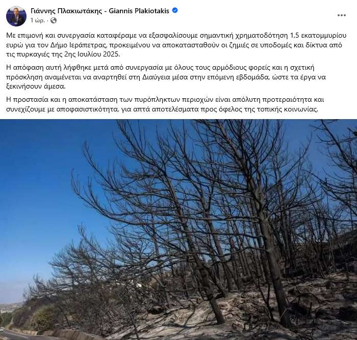 Και τι μας λέει; “Με επιμονή και συνεργασία καταφέραμε να εξασφαλίσουμε σημαντική χρηματοδότηση 1,5 εκατομμυρίου ευρώ για τον Δήμο Ιεράπετρας, προκειμένου να αποκατασταθούν οι ζημιές”. Αν κάτι “κατάφερε” ο βουλευτής, είναι να μειωθεί η χρηματοδότηση.
