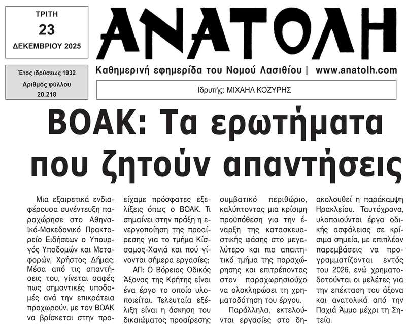 Μια εξαιρετικά ενδιαφέρουσα συνέντευξη παραχώρησε στο Αθηναϊκό-Μακεδονικό Πρακτορείο Ειδήσεων ο Υπουργός Υποδομών και Μεταφορών, Χρήστος Δήμας. Μέσα από τις απαντήσεις του, γίνεται σαφές πως σημαντικές υποδομές ανά την επικράτεια προχωρούν, με τον ΒΟΑΚ να βρίσκεται στην προμετωπίδα. Ωστόσο, για εμάς στο Λασίθι, η ανάγνωση πίσω από τις γραμμές είναι επιβεβλημένη.