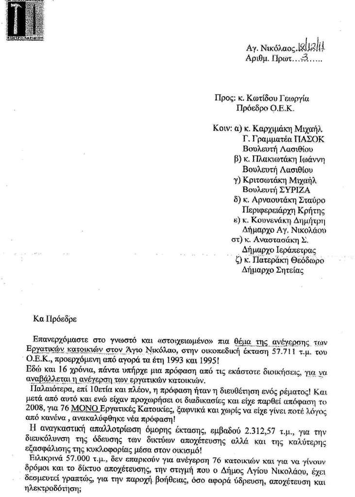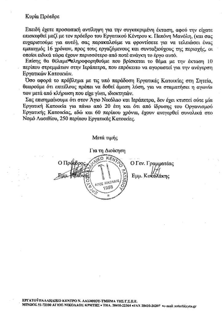 - Το Εργατοϋπαλληλικό Κέντρο Λασιθίου κατέγραψε σε έγγραφό του το 2011 δεκαετίες αδικίας σχετικά με ένα οικόπεδο που προοριζόταν για εργατικές κατοικίες από τη δεκαετία του 1990, το οποίο παρέμενε ανεκμετάλλευτο λόγω συνεχών αναβολών και προφάσεων.