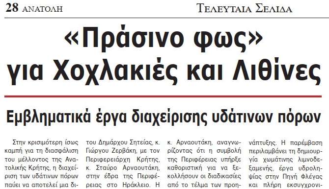 Το τοπίο γύρω από τον προγραμματισμό αυτών των έργων ξεκαθάρισε περαιτέρω μετά την πρόσφατη συνάντηση του Δημάρχου Σητείας, κ. Γιώργου Ζερβάκη, με τον Περιφερειάρχη Κρήτης, κ. Σταύρο Αρναουτάκη, στην έδρα της Περιφέρειας στο Ηράκλειο. Η συνάντηση αυτή δεν είχε μόνο εθιμοτυπικό χαρακτήρα, αλλά επιβεβαίωσε τη στενή συνεργασία των δύο βαθμών αυτοδιοίκησης στο πλαίσιο της υποστήριξης δύο μεγάλων έργων: το φράγμα στις Χοχλακιές και το μεγαλεπήβολο φράγμα των Λιθινών.