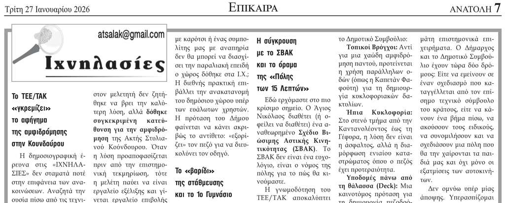 Δεν ομνύω υπέρ μίας άποψης. Υπερασπίζομαι όμως με ακέραιο τρόπο τον ολοκληρωμένο σχεδιασμό και απορρίπτω τις πρόχειρες λύσεις που δεν εξυπηρετούν την ενιαία αντίληψη της βιώσιμης κινητικότητας. Σε όλη την Ευρώπη δεν είναι πολυτέλεια η βιώσιμη κινητικότητα. Είναι δικαίωμα. Είναι απαίτηση. Είναι όρος επιβίωσης και ποιότητας ζωής. Όσο γράφω στην ΑΝΑΤΟΛΗ, θα συνεχίσω να «ιχνηλατώ» κάθε απόφαση που επηρεάζει αυτό το δικαίωμα που έχουν ΑμεΑ, μανάδες, παιδιά, ηλικιωμένοι, τουρίστες κι όλοι εμείς που θέλουμε να απολαμβάνουμε αυτόν τον προικισμένο από τη φύση τόπο. Για αυτό και υπογραμμίζω πάντα την ανάγκη, η διαχείριση των τοπικών υποθέσεων να γίνεται με καθαρό βλέμμα, συγκροτημένο τρόπο και βέλτιστες επιλογές. Έχουμε όλοι την υποχρέωση να το πράξουμε, όσο, όπως μπορούμε και μας αναλογεί. Η μέγιστη ευθύνη ανήκει στην Δημοτική Αρχή. Οι συνέπειες των αποφάσεων της θα επηρεάσουν τη ζωή όλων μας.