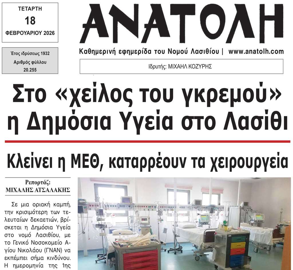 Σε μια οριακή καμπή, την κρισιμότερη των τελευταίων δεκαετιών, βρίσκεται η Δημόσια Υγεία στο νομό Λασιθίου, με το Γενικό Νοσοκομείο Αγίου Νικολάου (ΓΝΑΝ) να εκπέμπει σήμα κινδύνου. Η ημερομηνία της 1ης Μαρτίου 2026 φαντάζει ως εφιάλτης, καθώς, αν δεν υπάρξει άμεση ανατροπή των δεδομένων, η μοναδική Μονάδα Εντατικής Θεραπείας (ΜΕΘ) του νομού οδηγείται σε βέβαιη αναστολή λειτουργίας.