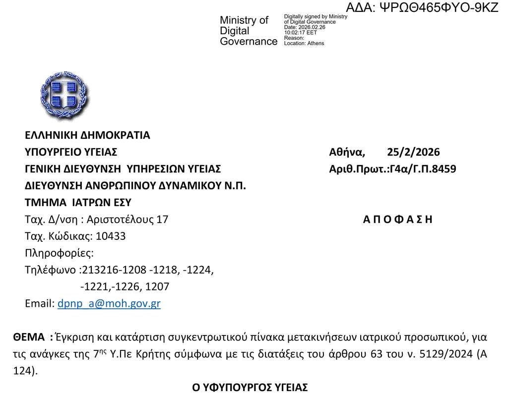 Η διοίκηση της 7ης ΥΠΕ Κρήτης καλείται τώρα να προχωρήσει άμεσα στις απαραίτητες ενέργειες ώστε να ενημερωθούν οι ενδιαφερόμενοι και να υλοποιηθεί η διαδικασία χωρίς καθυστερήσεις. Ηδη, ο Διοικητής της ΥΠΕ, Νεκτάριος Παπαβασιλείου, με έγγραφο του (ΑΠ:9605, 26/02/2026), απευθύνει πρόσκληση ενδιαφέροντος για ενδιαφερόμενους γιατρούς.