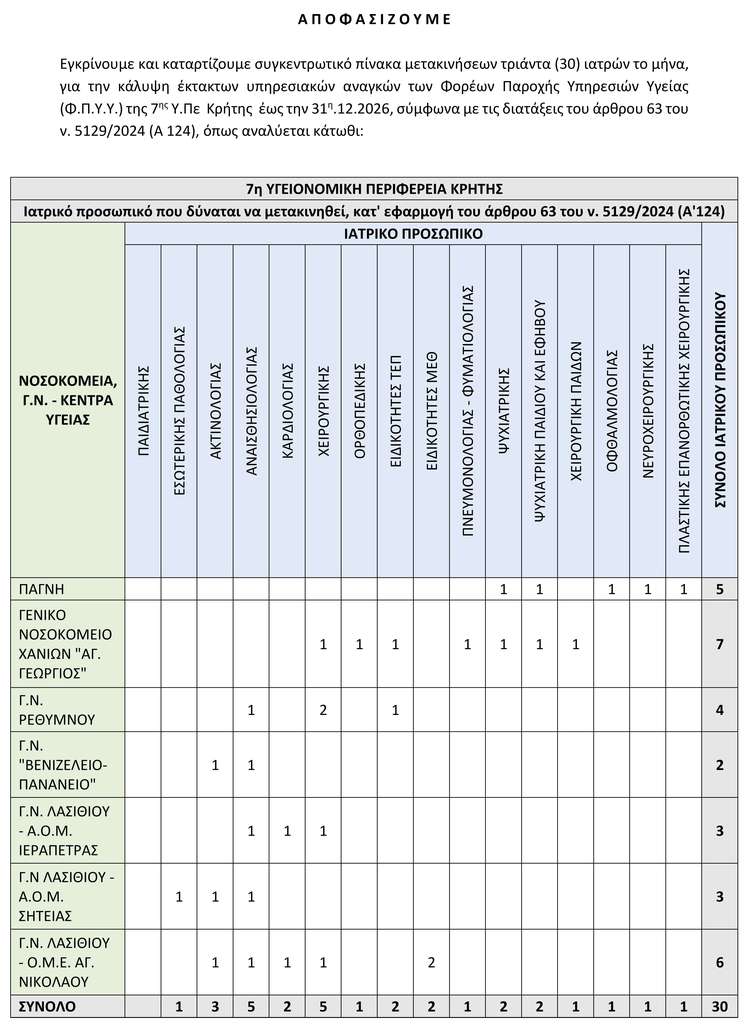 Η απόφαση προβλέπει τη μετακίνηση συνολικά 30 ιατρών, με το Λασίθι να λαμβάνει σημαντικό μερίδιο αυτών των ενισχύσεων. Συγκεκριμένα: